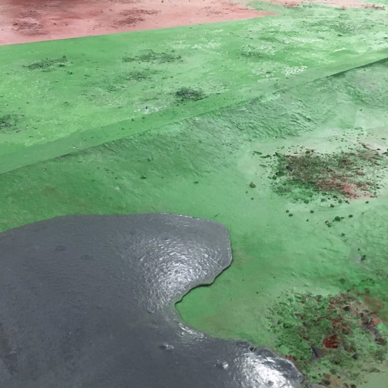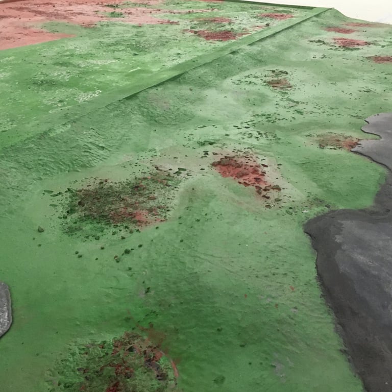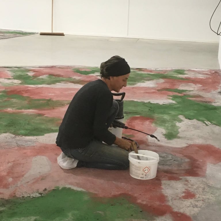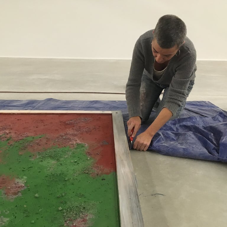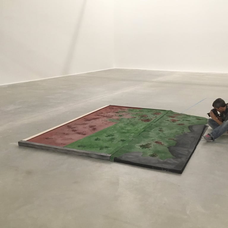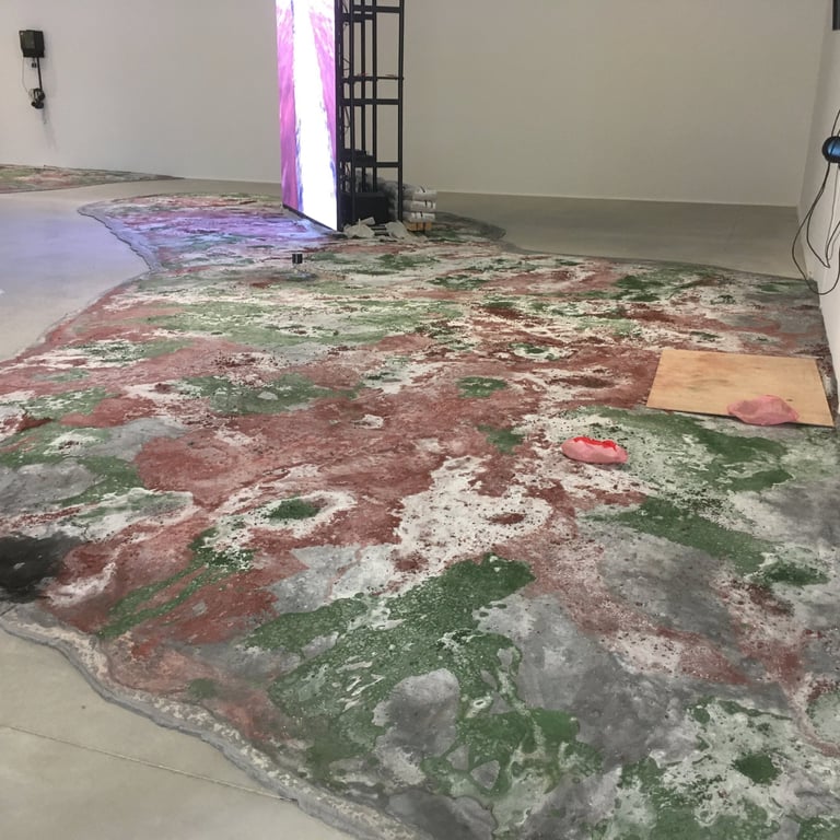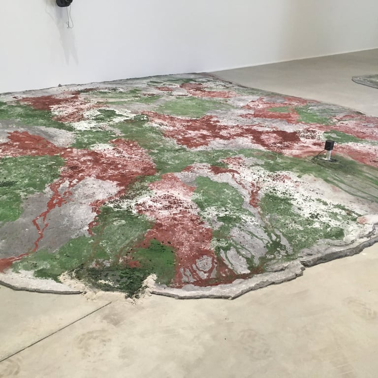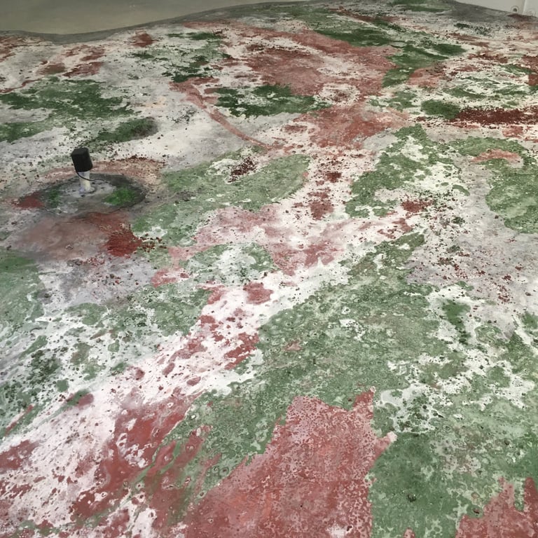 Pour cette installation, nous avons conçu des sols uniques, inspirés des paysages de Camargue, avec des teintes rouges et vertes intenses ponctuées d’efflorescences de sels. Ce sol spécifique a enrichi l’atmosphère immersive de l’exposition, en harmonie avec la vision artistique de Jakob Kudsk Steensen, qui célèbre la nature et ses nuances.