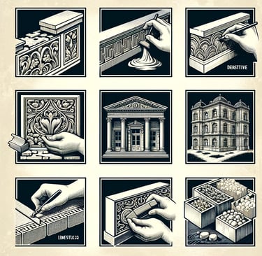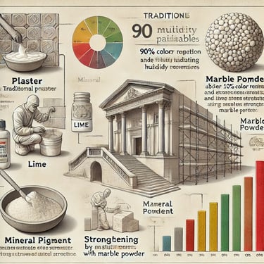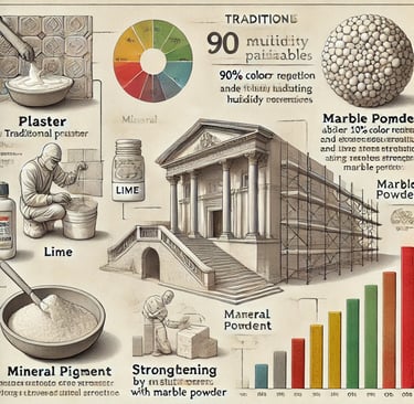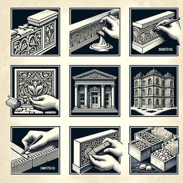 Les stucs, les enduits à base de plâtre et de chaux-plâtre sont utilisés depuis l'Antiquité pour créer des finitions élégantes, notamment dans les demeures romaines et grecques. Ces techniques offraient des textures uniques et des motifs artistiques, souvent enrichis de poudres de marbre et de pigments minéraux.